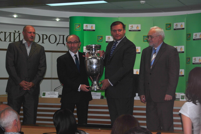 Геннадий Адольфович заверил присутствующих, что город готов к проведению чемпионата и приезду болельщиков из разных стран. Михаил Маркович в свою очередь признался, что никогда ранее не думал даже, что будет держать в руках легендарный трофей. Присоединился к словам губернатора и легендарный голкипер Металлиста Игорь Кутепов.