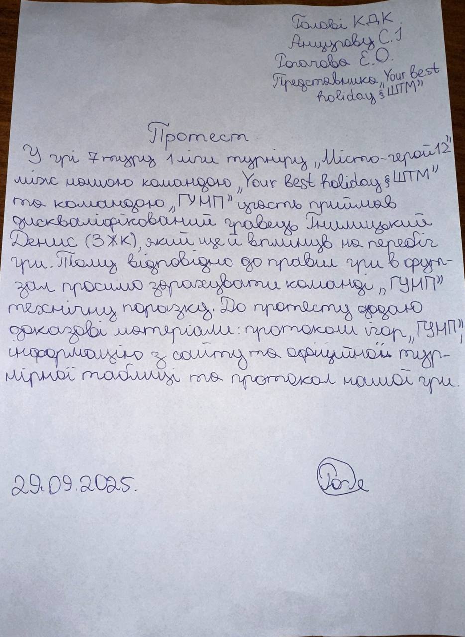 Контрольно-дисциплінарний комітет розглянув протест Your Best Holiday&ШТМ та вирішив присудити технічну поразку команді ГУНП у матчі 7 туру 1 ліги ГУНП - Your Best Holiday&ШТМ +/-.