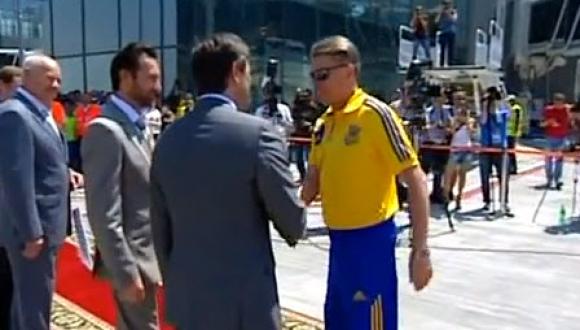 Футболистам и тренерскому штабу презентовали вымпел принимающего города, а также, по традиции, каравай, который первым попробовал наставник команды Олег Блохин.