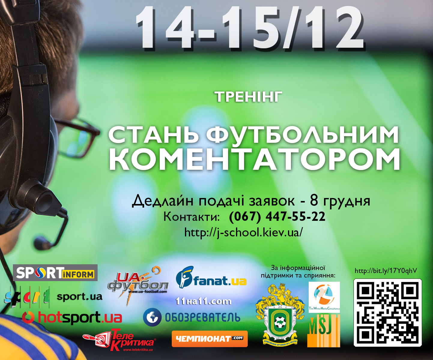 14-15 декабря пройдет интенсивный тренинг для тех, кто мечтает о карьере футбольного комментатора или желает повысить свою квалификацию. Тренинг проводит совместно Могилянская школа журналистики(Национальный университет «Киево-Могилянская Академия») и британская компания «Tim White MediaConsultancy Ltd.».