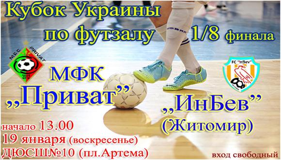1/8 Кубка Украины по футзалу. МФК "Приват" - МФК "ИнБев"(Житомир) 19.01(воскресенье) в 13.00 в ДЮСШ №10 (пл. Артема).