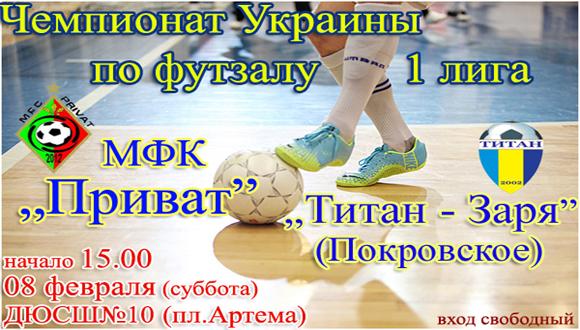 Чемпионат Украины по футзалу 1 лига МФК "Приват" - "Титан-Заря" (Покровское) 08.02.14г.(суббота) в 15.00 ДЮСШ№10(пл. Артема)