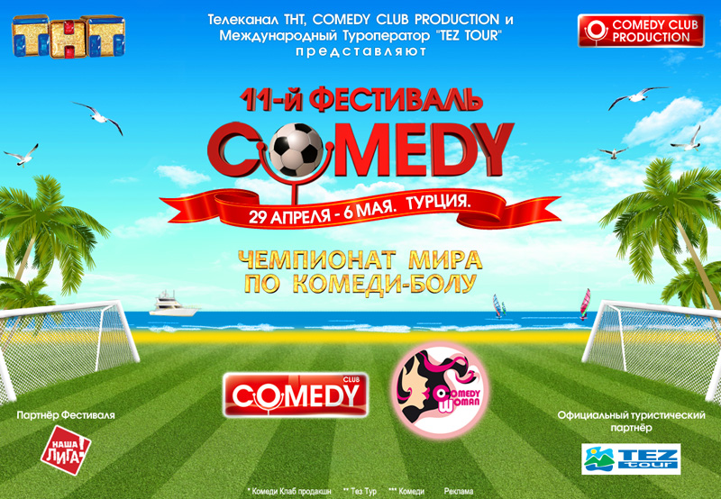 Фестиваль Comedy – абсолютно уникальное развлечение. Это неделя, пролетающая как один день, это новые друзья и старые знакомые, это ни на что не похожий формат живого общения со звездами телевидения, кино и шоу-бизнеса, и впечатления, которые остаются, если уж не в памяти, то на фотографиях. Если ты уже был на фестивале, то тебе все это и так известно. А если нет – то… Успей купить путевку, пока открыто трансферное окно! Войди в самую смешную сборную! Получи желтую карточку, не вставая с шезлонга!